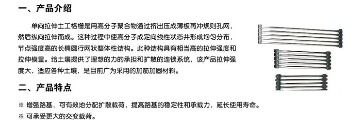 單向拉伸的土工格柵是由高分子聚合物經(jīng)擠出壓成薄板再沖規(guī)則孔網(wǎng),然后縱向拉伸而成。這種過程中使高分子成定向線性狀態(tài)并形成分布均勻、節(jié)點強度高的長 橢圓形網(wǎng)狀整體性結(jié)構(gòu)。此種結(jié)構(gòu)具有相當高的拉伸強度和拉伸模量,特別是我公司此類產(chǎn)品更具有超國際水平的高早期(伸長率在2%—5%)拉伸強度和拉伸模 量。給土壤提供了理想的力的承擔和擴散的連鎖系統(tǒng)。該產(chǎn)品拉伸強度大(>150Mpa),適應(yīng)各種土壤,是目前廣為采用的加筋加固材料。